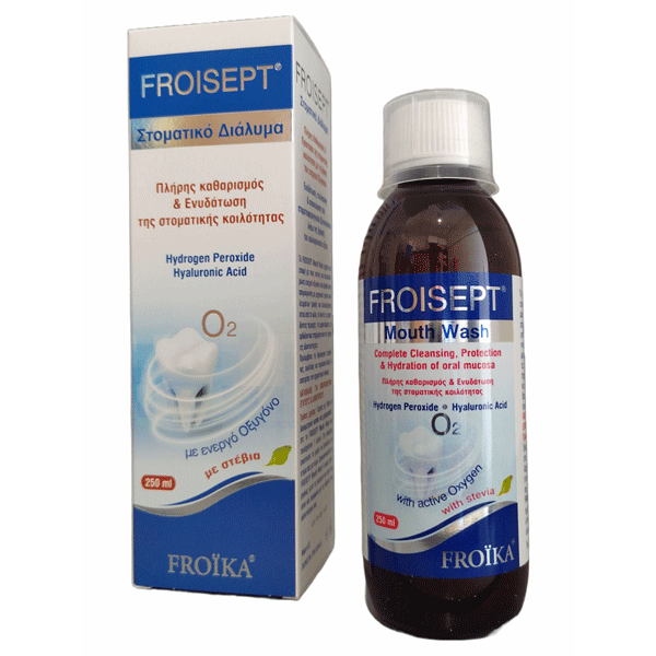 Το FROISEPT Mouth Wash έρχεται σε επαφή µε τους ιστούς και απελευθερώνει ενεργό οξυγόνο που βοηθά στην αποµάκρυνση µε µηχανικό τρόπο υπολειµµάτων τροφής και πλεονάζοντος ιστού από τα ούλα, τα δόντια, τις µεσοδόντιες περιοχές, τα εµφυτεύµατα, τα ορθοδοντικά στηρίγµατα και τις τεχνητές οδοντοστοιχίες.