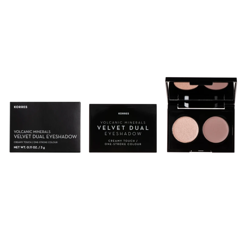 Παλέτα σκιών δύο αποχρώσεων με μοναδική βελούδινη υφή εμπλουτισμένη με ηφαιστειακά ιχνοστοιχεία που διαμορφώνει και σμιλεύει το βλέμμα αποδίδοντας έντονο χρωματικό αποτέλεσμα.