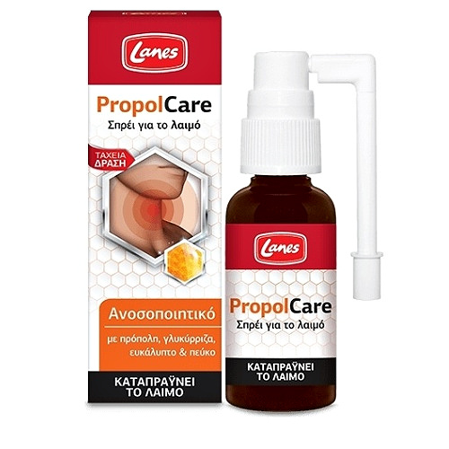 Ιδιότητες: Το Propolcare σπρέι για το λαιμό περιέχει πρόπολη και συγκεκριμένα το επώνυμο εκχύλισμα PropolhAlcool, που είναι τιτλοδοτημένο υδροαλκοολικό διάλυμα πρόπολης με υψηλή περιεκτικότητα σε φλαβονοειδή όπως η γαλανγίνη 45mg/ml. Η πρόπολη θεωρείται ως «φυσικό αντιβιοτικό» και συμβάλλει στην αντιμετώπιση των συμπτωμάτων του κοινού κρυολογήματος χάρη στις αντισηπτικές και αντιοξειδωτικές ιδιότητες. Περιέχει ακόμη γλυκύρριζα και αιθέρια έλαια ευκαλύπτου και πεύκου. Η γλυκύρριζα έχει αποχρεμπτική δράση, ενυδατώνει και απαλύνει το λαιμό, το αιθέριο έλαιο ευκάλυπτου έχει μαλακτική και καταπραϋντική δράση, ενώ το αιθέριο έλαιο πεύκου έχει αντισηπτική και αποχρεμπτική δράση.