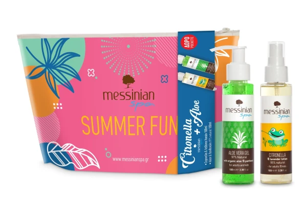 Η Messinian spa Σιτρονέλα-Λεβάντα Λοσιόν περιέχει ένα σούπερ μείγμα από αιθέρια έλαια, σιτρονέλα, λεβάντα, γεράνι, γαρύφαλλο, ευκάλυπτο, πορτοκάλι, κανέλα, λεμονόχορτο, βασιλικό και φυσικά ενυδατικά και καταπραϋντικά συστατικά, όπως ΠΟΠ ελαιόλαδο από την Καλαμάτα, αλόη και πανθενόλη. Είναι ιδανικό για ενήλικες και παιδιά, για χρήση σε εσωτερικούς και εξωτερικούς χώρους, τις καλοκαιρινές νύχτες, κάμπινγκ και διακοπές.