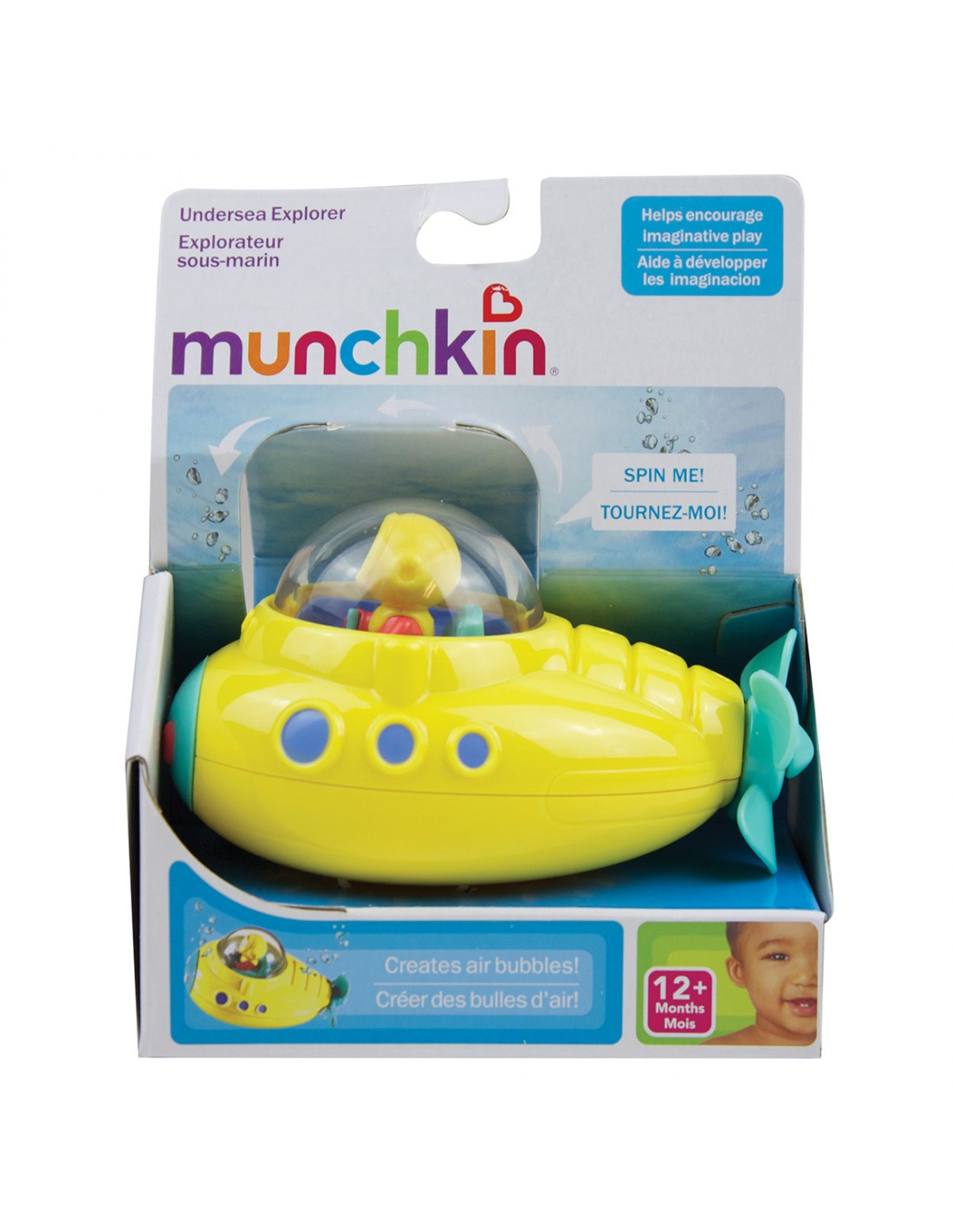 Πρόσω ολοταχώς! Ώρα να ανακαλύψετε τον ωκεανό με το διασκεδαστικό υποβρύχιο μπάνιου. Το υποβρύχιο Undersea Explorer της Munchkin είναι ιδανικό για αξέχαστες περιπέτειες στον βυθό της μπανιέρας. Οι μικροί εξερευνητές δεν θα χορταίνουν να κάνουν βουτιές, καταδύσεις και να σχηματίζουν μπουρμπουλήθρες με αυτό το κίτρινο υποβρύχιο. Οι οπές στο πλαίσιο δημιουργούν μπουρμπουλήθρες όταν βυθίζεται στο νερό και η προπέλα περιστρέφεται ελεύθερα, κάνοντας το παιχνίδι πιο ρεαλιστικό. Χάρη στο βαρίδι στην καμπίνα, ο καπετάνιος επανέρχεται πάντα στη θέση του! Αυτό το δημιουργικό παιχνίδι μπάνιου είναι ιδανικό για μωρά που αναπτύσσουν κινητικές ικανότητες και για παιδιά με φαντασία που οργιάζει.