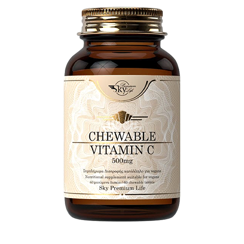 Sky Premium Life Vitamin C, δισκία παρατεταμένης αποδέσμευσης που περιέχουν 500 mg ασκορβικού οξέος. Η βασική βιταμίνη σε ένα μασώμενο δισκίο.”