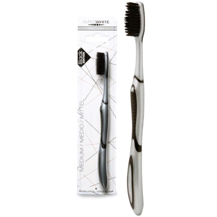 Οδοντόβουρτσα Superwhite Black Edition Medium, με ειδική επιφάνεια για καθαρισμό της γλώσσας, υψηλής ποιότητας νάιλον ίνες και αντιολισθητική λαβή.