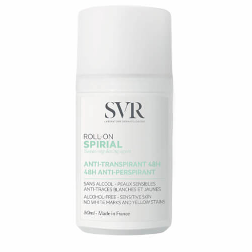 To SVR Spirial Anti-Perspirant Deodorant Roll-On 48h 50ml είναι ένα αντιιδρωτικό που όχι μόνο προστατεύει από την υπερβολική εφίδρωση, αλλά βοηθά επίσης στον έλεγχο της υπερβολικής οσμής στις μασχάλες. Η νέα και βελτιωμένη σύνθεσή του, προσφέρει την ίδια αποτελεσματικότητα με τον προκάτοχό του με πρόσθετα οφέλη. Με χλωροϋδρικό αργίλιο και σκόνη διατομικής γης, έχει την ικανότητα να απορροφά την υγρασία ακόμη και κατά τη διάρκεια των αιχμών της εφίδρωσης και να βοηθά, ως εκ τούτου, στη ρύθμιση της εφίδρωσης. Με ένα προβιοτικό που συμβάλλει στη μείωση των βακτηρίων που ευθύνονται για τις οσμές, προσφέρει αντιοσμητική δράση αποτρέποντας τις άσχημες μυρωδιές του σώματος. Και με την αλλαντοΐνη, όχι μόνο μαλακώνει το δέρμα αλλά και ανακουφίζει και αποτρέπει τους ερεθισμούς.