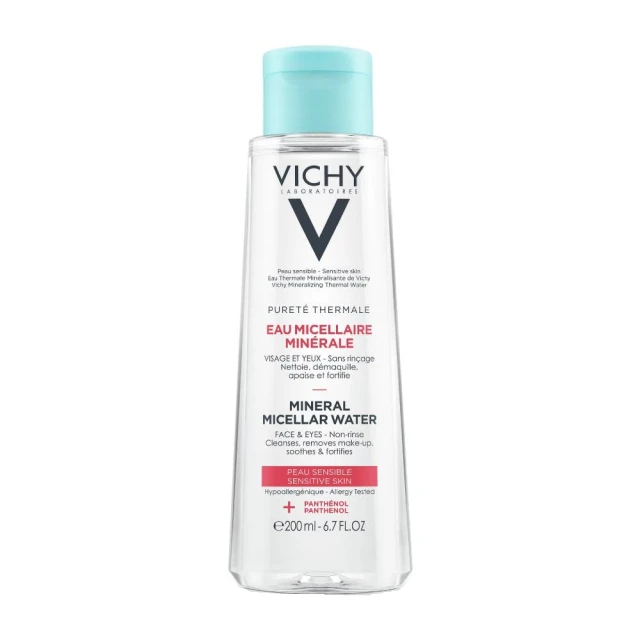 Purete Thermale Mineral Micellar Water για την ευαίσθητη επιδερμίδα. Ισχυρό καθαριστικό Micellaire εμπλουτισμένο με Ιαματικό νερό της Vichy και πανθενόλη για ενυδάτωση. Ενδυναμώνει τον επιδερμιδικό φραγμό, δυναμώνει και προστατεύει από την ξηρότητα στο πρόσωπο και τα μάτια. Δεν ξεβγάζεται. 98% Βιοδιασπώμενο. Συσκευασία των 200ml.