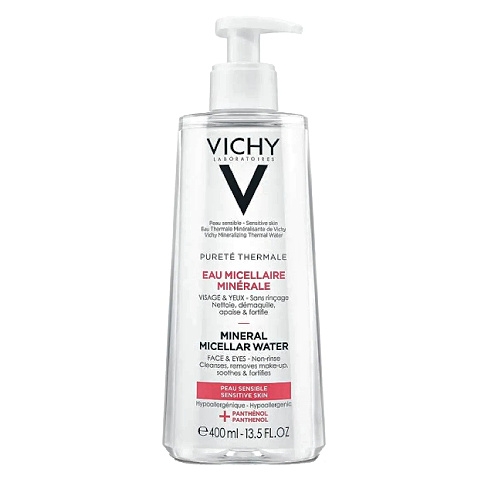 Purete Thermale Mineral Micellar Water για την ευαίσθητη επιδερμίδα. Ισχυρό καθαριστικό Micellaire εμπλουτισμένο με Ιαματικό νερό της Vichy και πανθενόλη για ενυδάτωση. Ενδυναμώνει τον επιδερμιδικό φραγμό, δυναμώνει και προστατεύει από την ξηρότητα στο πρόσωπο και τα μάτια. Δεν ξεβγάζεται. 98% Βιοδιασπώμενο. Συσκευασία των 400ml.